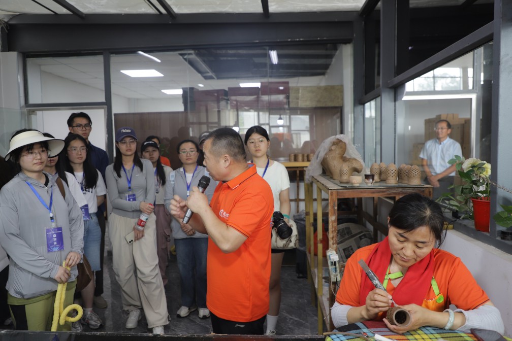 龍格黑陶藝術(shù)研究院內(nèi),傳統(tǒng)工藝與現(xiàn)代創(chuàng)新的完美融合。省級(jí)非物質(zhì)文化遺產(chǎn)項(xiàng)目代表性傳承人徐慶增老師帶領(lǐng)師生們參觀黑陶生產(chǎn)車間,他特別提到,濟(jì)陽黑陶以黃河泥為原料,經(jīng)選土、拉坯、雕刻、燒制等20余道工序制成,其“黑如漆、亮如鏡”的獨(dú)特質(zhì)感源于高溫窯變的自然反應(yīng)?,F(xiàn)場演示了拉坯、雕刻技藝,手中的陶土仿佛被賦予了生命,在指尖的舞動(dòng)下逐漸成型。師生們在專業(yè)藝人的指導(dǎo)下,從揉泥、拉坯到成型,親自體驗(yàn)了黑陶的制作,最終創(chuàng)作出了屬于自己的黑陶作品。